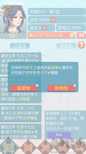 5、然后就會(huì)自動(dòng)開始劇情故事了,左側(cè)是已發(fā)生的事件,右側(cè)是待發(fā)生的隨機(jī)事件,需要自由做出選擇,不同選擇會(huì)對(duì)未來(lái)的命運(yùn)產(chǎn)生不同的影響。