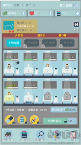 3、玩家需要及時(shí)的購(gòu)買(mǎi)各種物資并且按時(shí)進(jìn)行一個(gè)消毒,這樣可以避免延長(zhǎng)病人的治療時(shí)間。