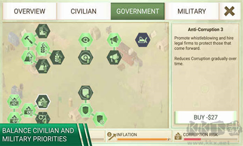 在對區(qū)域進行修整和發(fā)展的同時還要時刻的防范叛軍篡奪權力的圖謀。當然,這片建設的道路并不是那么的平坦,期間玩家會遇到各種問題,各種通貨膨脹、政府腐敗、國際輿論等問題,你做好準備來阻止這場叛亂了嗎?
