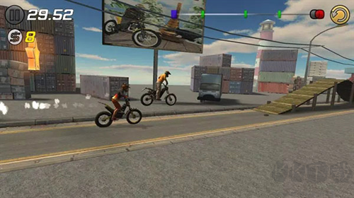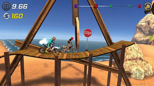 1、極限摩托3設(shè)計(jì)了一套全新的背景,將競(jìng)技場(chǎng)地搬到了擁有開闊景致的海邊,而高架凌空的場(chǎng)地設(shè)施,不僅讓你可以一覽美麗景色,也帶來了臨空失重的刺激。