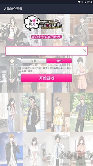 1、進(jìn)入劣充中文版游戲之后,我們需要先填寫角色昵稱,再選擇性別,型別不同,游戲中可攻略的角色也不同。