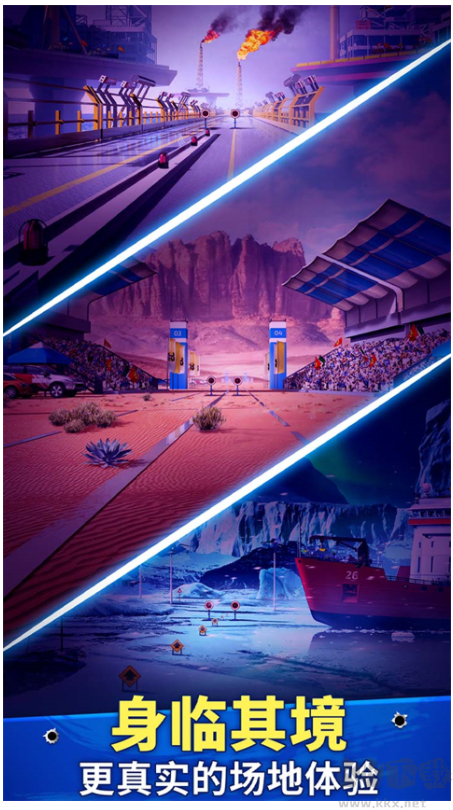 2、眾多的比賽場景,玩家可以前往摩天樓頂?shù)母呖瞻袌鎏魬?zhàn)自己的射擊技巧,也可以在廣袤無垠的戈壁沙漠靶場中,盡享射擊比賽的無窮魅力,各種各樣的射擊場景,都會讓您不斷的解鎖。