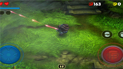 這款游戲采用3D雙搖桿操作,左下角的虛擬搖桿控制角色移動(dòng),右下角的F按鈕是攻擊鍵,游戲支持自動(dòng)瞄準(zhǔn),你只需控制怪物,按住F按鈕不停攻擊即可,操作十分簡(jiǎn)單。