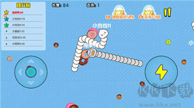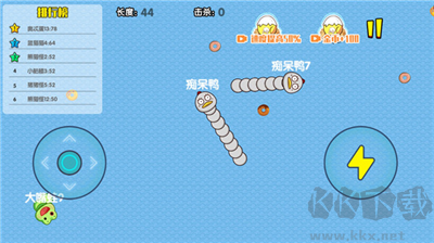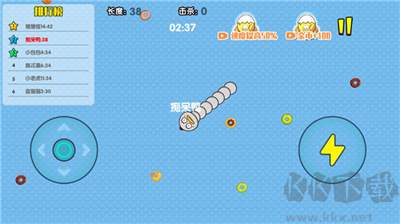 1、發(fā)育期:在游戲的前兩分鐘蛇蛇們都很短,擊殺獲得的能量很少而加速還要浪費(fèi)能量,本身長度也不夠無法對(duì)敵人形成有效的威脅。嘗試擊殺是可以的,但是更重要的是發(fā)育,吃閃亮的飛行能量塊能讓你迅速長大!