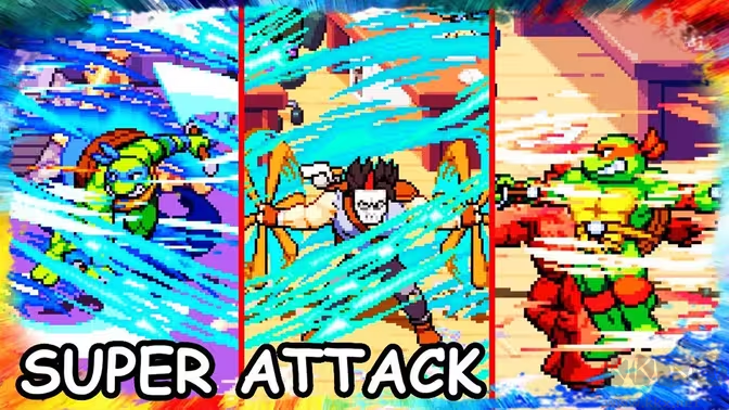 《忍者神龜:施萊德的復(fù)仇》的游戲玩法具有開創(chuàng)性,它根植于永恒的經(jīng)典清版闖關(guān)機(jī)制,由Dotemu和Tribute Games的游戲?qū)<覟槟鷰順O致的打斗體驗。在精致的像素畫面中干掉成噸搞笑的敵人,操作你最喜歡的忍者神龜,每個角色都有自己的技能和移動招式。
