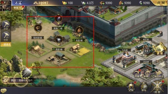 資源建筑在開(kāi)始的時(shí)候就解鎖了,其中包含四個(gè)建筑(伐木場(chǎng)、煉鐵廠、民居、農(nóng)田),分別產(chǎn)出不同的四種基礎(chǔ)資源,伐木場(chǎng)產(chǎn)出木材,煉鐵廠產(chǎn)出鐵礦,民居產(chǎn)出銀兩,農(nóng)田產(chǎn)出糧食。資源建筑可升級(jí),越高級(jí)的建筑產(chǎn)出的收益就越高,平民的話最好優(yōu)先升級(jí)資源建筑,這樣可以很大緩解后期的資源壓力。