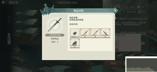55無(wú)名幻境/夜戰(zhàn)洛陽(yáng),第四個(gè)寶箱獎(jiǎng)勵(lì)有1個(gè)千鍛昆吾箱,4個(gè)挑戰(zhàn)券一次,