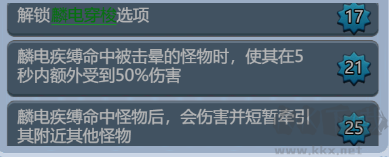 21級:麟電疾縛命中被擊暈的怪物時,使其在5秒內額外受到50%傷害。