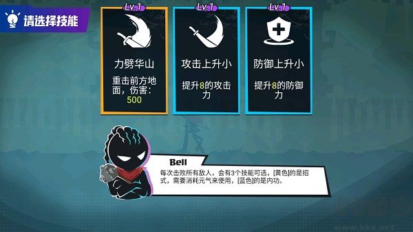 3.每次擊敗所有敵人,都會有三種技能選擇?!军S色】是一種招式,需要消耗活力,【藍(lán)色】是內(nèi)功。
