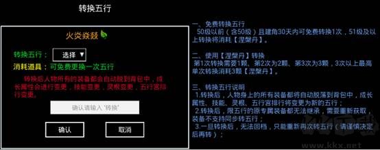 無需多說,主要展示玩家屬性。面板上有“轉(zhuǎn)換五行”按鈕,方便玩家嘗試不同五行角色;“說明”功能,可以了解各個(gè)屬性特點(diǎn)。
