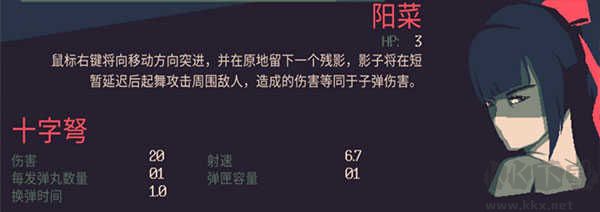 HP:3鼠標(biāo)右鍵將向移動(dòng)方向突進(jìn),并在原地留下一個(gè)殘影,影子將在短暫延遲后起舞攻擊周圍敵人,造成的傷害等同于子彈傷害。