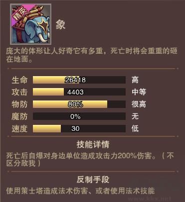 擁有80%物理抗性,死亡后自爆對身邊單位造成攻擊力200%的傷害(不分敵我)