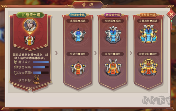 中級、高級、頂級箭塔分別在武將等級:10級、30級、45級時可以開啟晉級。顧名思義,級別越高,攻擊傷害和攻擊范圍也會隨之上漲。(主公請努力的戰(zhàn)斗升級吧!