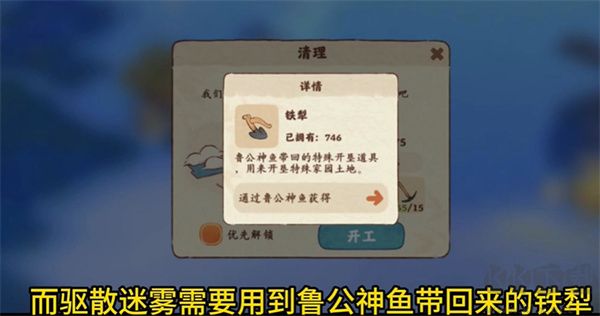 3、要想驅散迷霧,還得解鎖更大的區(qū)域,直接使用魯公神魚帶回來的鐵犁。