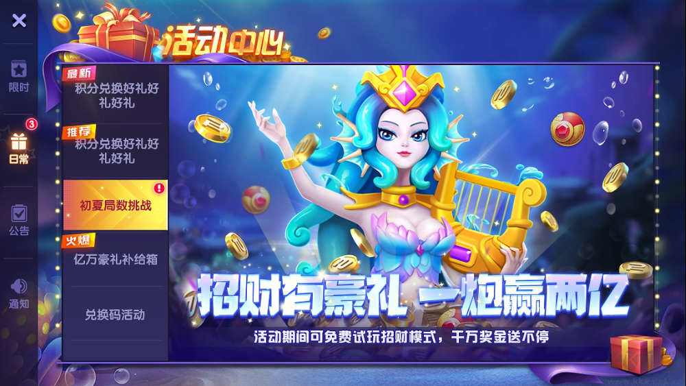3、玩家從此告別單調(diào)乏味的單機(jī)捕魚(yú)模式,可每日暢享捕魚(yú)樂(lè)趣,收獲豐厚金幣獎(jiǎng)勵(lì),盡享游戲帶來(lái)的持續(xù)驚喜與歡樂(lè)。