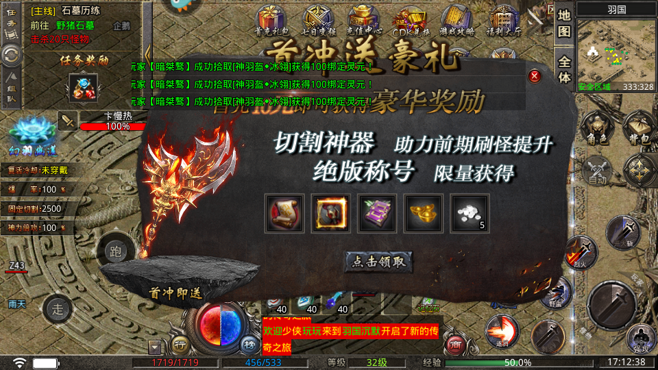 3、有首充禮包,首充得豪華獎勵,切割神器助前期刷怪提升,還有絕版稱號;