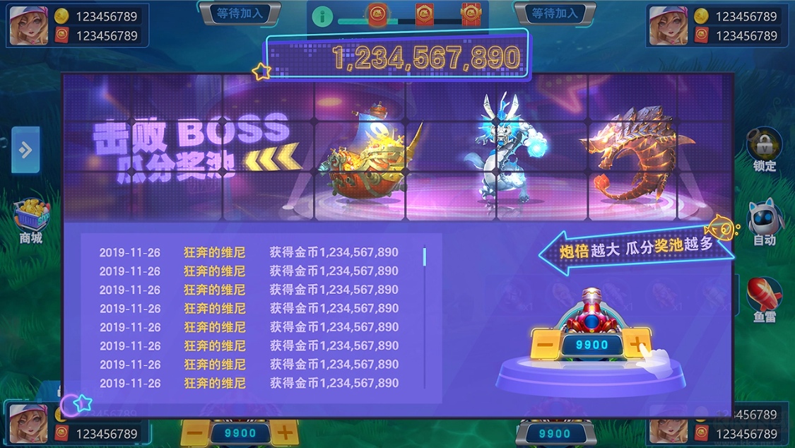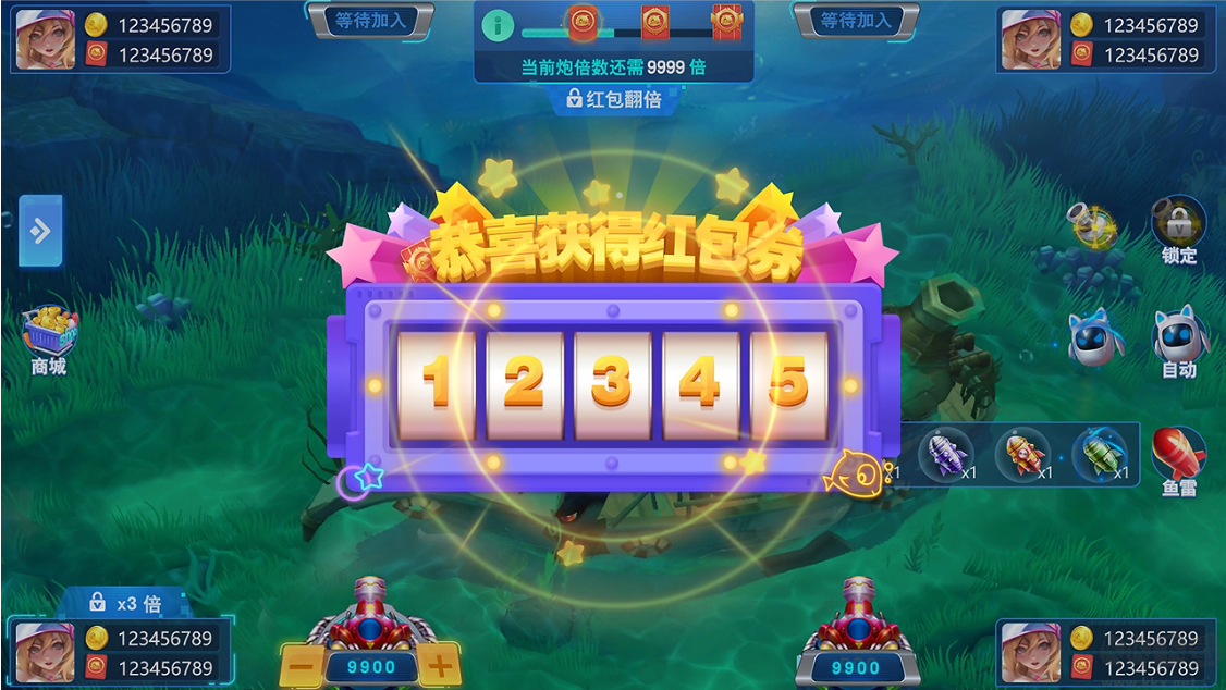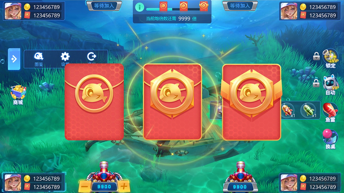 2、定屏、加速、鎖定等酷炫技能,玩家可借此對魚群進行狂轟濫炸,制霸海底。