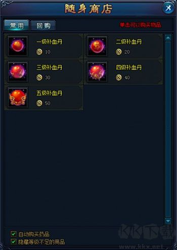 點(diǎn)擊背包界面中的【商店】按鈕,可以進(jìn)入上圖所示的個(gè)人的隨身商店,玩家可在其中購買常用的道具。