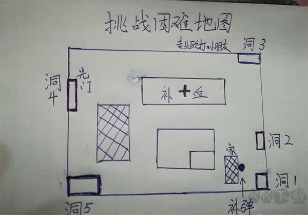 對于尚不熟悉困難模式打法的人員,建議事先了解困難模式的平面圖。需注意,入口 3、4、5 均會出現(xiàn)飛機(jī)怪,此飛機(jī)怪對于不熟悉困難模式打法的人員而言堪稱 “噩夢”。因此,我們的主要策略是重點(diǎn)守住 1 和 2 兩個入口,安排火力較強(qiáng)的人員負(fù)責(zé)把守 3、4、5 入口。(現(xiàn)附上平面圖,若繪制欠佳,還望海涵。)