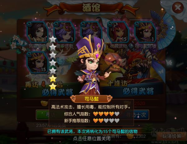 建議大家先做任務(wù)升級(jí),順便攢元寶。前期元寶產(chǎn)出多,攢到 2520 元寶可十連抽。別單抽。首次酒館十連抽基本是張飛,建議再抽兩次,一般出黃忠、司馬懿、周瑜、曹沖,抽到其中三個(gè)就別抽了,這些武將夠玩游戲。抽到已有的武將,會(huì)自動(dòng)轉(zhuǎn)為相應(yīng)信物~