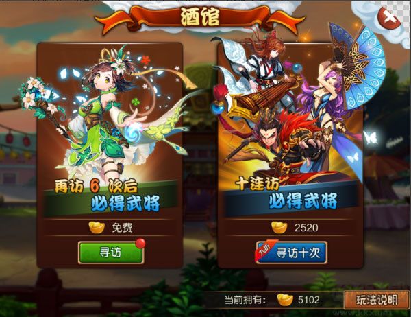 從圖中可見(jiàn),神魔傳抽卡分單抽和十連抽。單抽出武將幾率小,24 小時(shí)可免費(fèi)抽 1 次;十連抽必出武將,需花元寶抽。下面講抽將。