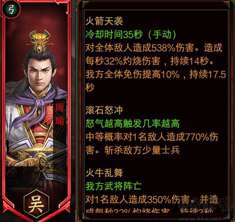 最后是周瑜,群傷極高,能對敵方全體造成 538% 傷害,還有每秒 32% 灼燒傷害,持續(xù) 14 秒,還可使全軍免傷提高 10%,持續(xù) 17.5 秒。群傷不用周瑜用誰,且他與小喬有緣分武將附加傷害。