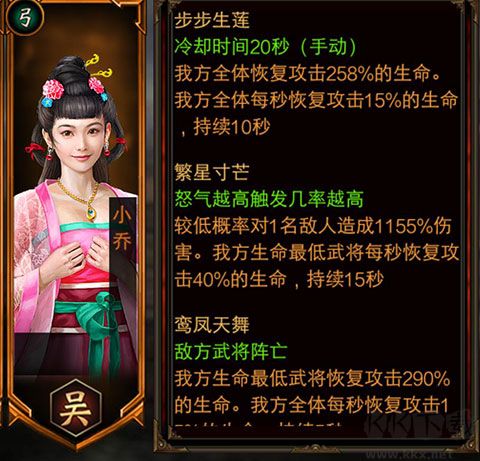 第三個武將是小喬(個人偏愛小喬,大家也能換成劉備、荀彧或華佗,各有好處。小喬技能:全體恢復(fù)攻擊 258% 生命,我方全體 10 秒內(nèi)恢復(fù)攻擊的 15% 生命,還能造成 1155% 傷害。小編喜歡小喬,大家可試用。