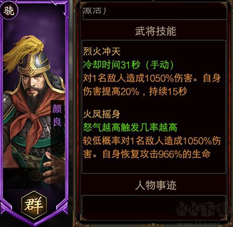 小編推舉第二個武將顏良。別看劇情任務(wù)送的顏良是紫色武將,傷害可相當(dāng)高。技能對敵人傷害 1050%,自身提傷 20%,還能恢復(fù)攻擊的 966% 生命,經(jīng)濟(jì)實惠,適合試用。