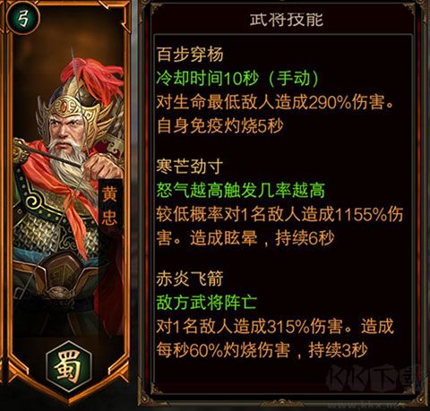 第一個武將黃忠,弓將,技能冷卻僅 10 秒,能造成 290% 傷害,自身免疫 5 秒灼燒傷害,第二個技能可眩暈 6 秒,推圖白送,有經(jīng)濟(jì)優(yōu)勢。