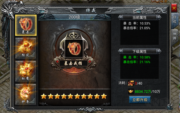 特戒劃分為神劍、暴擊、狂風、虹魔、護身等類別,各類特戒均具備獨特的專屬屬性。每提升一個等級,相應屬性亦會隨之提升。提升特戒等級需消耗一定數(shù)量的特戒碎片與元寶。