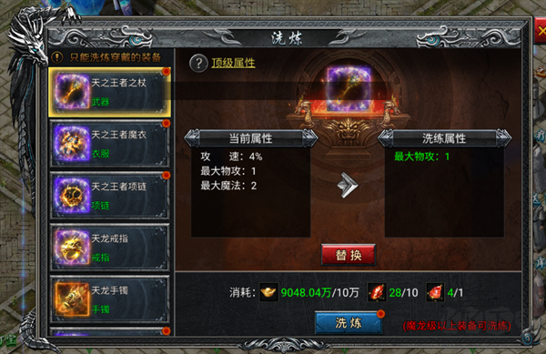 普通洗練所使用的材料為洗練石;對于配飾洗練,除洗練石外,還需星王結晶。此外,參與洗練的裝備必須達到魔龍級及以上等級。不同稀有程度的裝備,其洗練上限有所不同 。