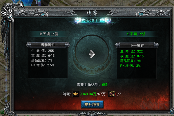 此乃一項能夠提升生命值、攻擊與魔道能力、藥品回復效果,以及在 PK 場景中實現(xiàn)增傷效果的玩法機制??捎诿酥氐貓D坐標 124.87 處尋得 NPC,借此進行境界晉升操作;亦能夠通過功能欄中的 “境界” 選項實施升階。境界提升所需的材料為境界卷軸,該卷軸可通過擊殺怪物、參與掛機副本獲取。在合成功能模塊中,可將多余的卷軸進行合成升級,進而實現(xiàn)更高層次的境界晉升。