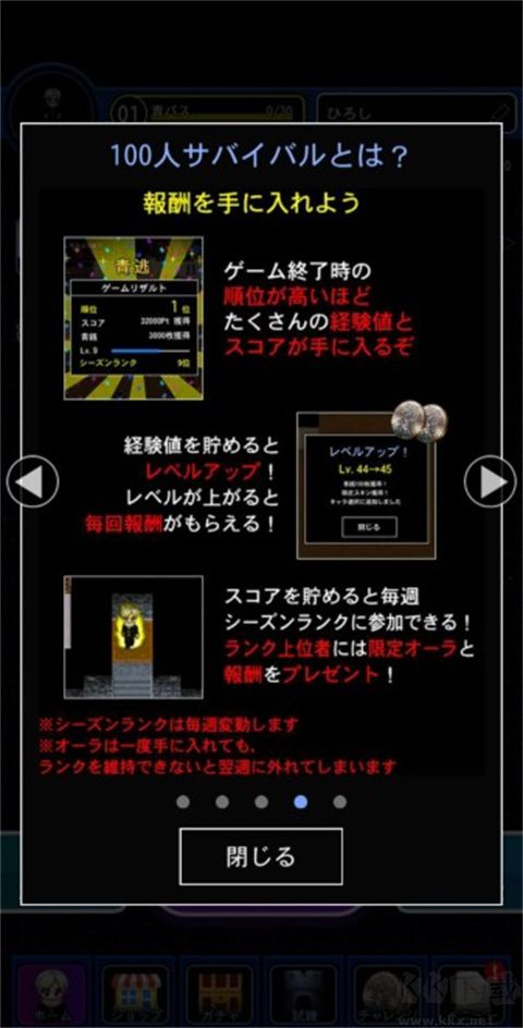 本游戲有 100 名參與者與青鬼進(jìn)行在線生成(此 100 名參與者中包含 NPC)。操控 100 名參與者中的任意一位,設(shè)法逃離青鬼的追蹤,直至最后一名玩家獲勝,