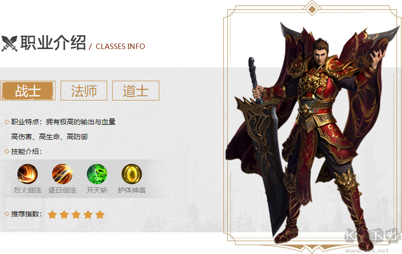 戰(zhàn)士:近戰(zhàn)職業(yè),擁有高額的攻擊力和防御力,適合沖鋒陷陣,為隊(duì)友提供保護(hù)。技能包括烈火劍法、逐日劍法等,能夠輸出爆炸性的傷害。戰(zhàn)士不僅適合喜歡近戰(zhàn)熱血PK的玩家,也是平民玩家的好選擇,因?yàn)槠淇箓δ芰^強(qiáng)。