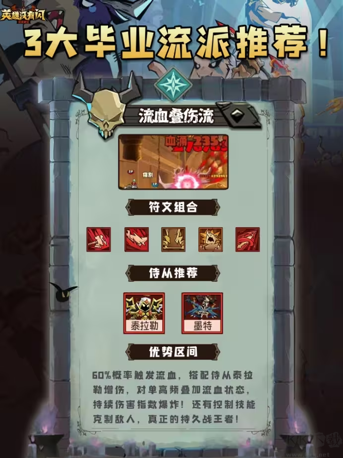 優(yōu)勢(shì):60%概率觸發(fā)流血,搭配侍從泰拉勒增傷,對(duì)單高頻疊加流血狀態(tài),持續(xù)傷害指數(shù)爆炸!還有控制技能,真正的持久戰(zhàn)王者!