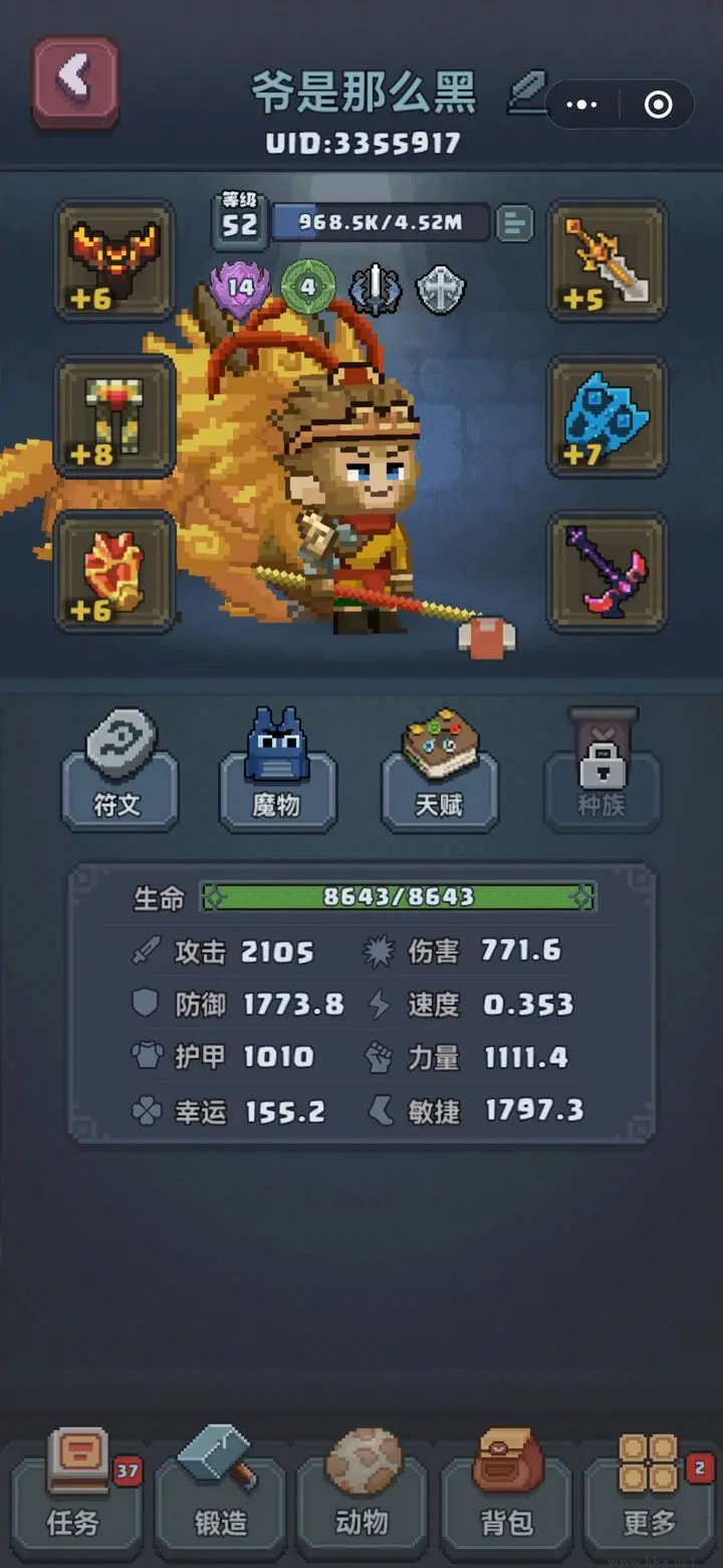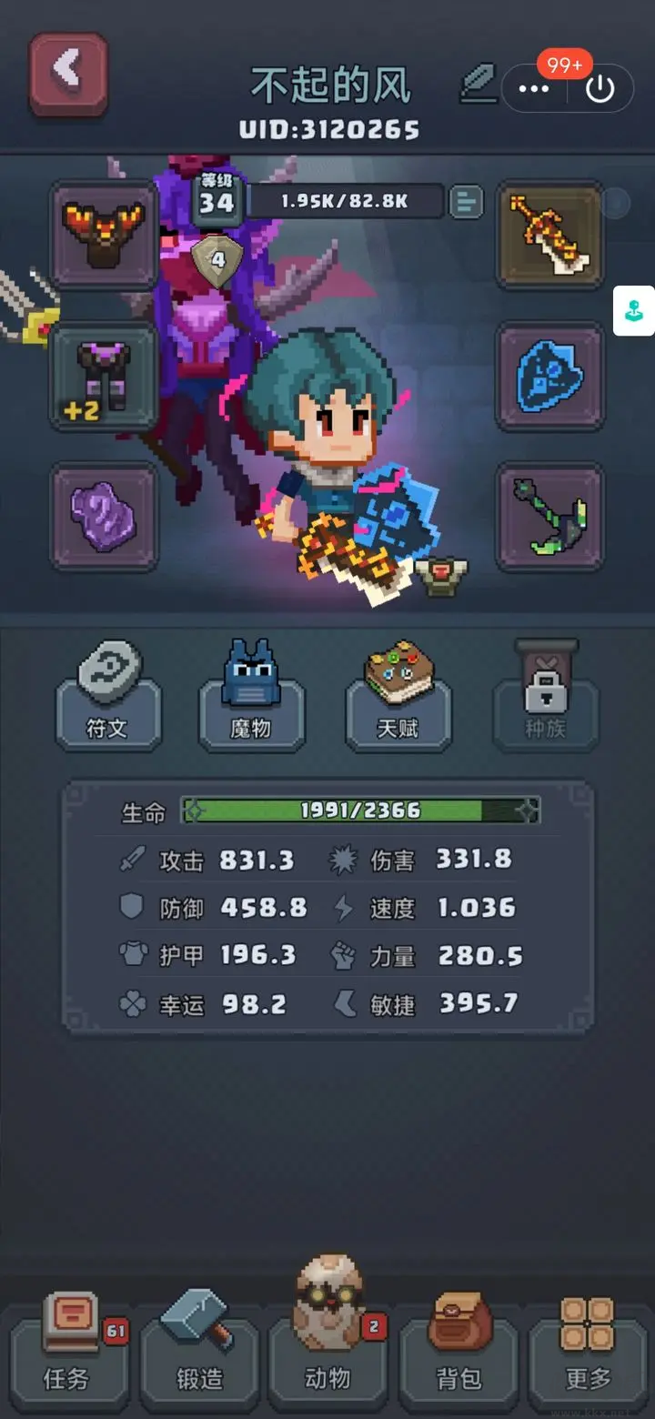 4、游戲以獨(dú)特像素畫風(fēng)呈現(xiàn),主線內(nèi)容豐富多樣,涵蓋武器、天賦、寵物、銘文等諸多元素,極具趣味性。