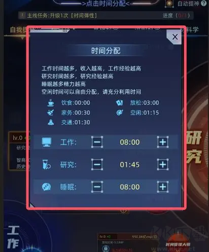 點(diǎn)擊出現(xiàn)操作界面,可以自由分配每天工作、研究、睡眠時(shí)間。