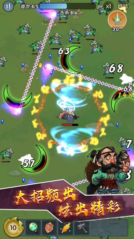 2、塔防元素的融合:除了割草玩法,游戲還融入了塔防元素。玩家需要策略性地布置防御,靈活運(yùn)用大俠的技能,以阻擋敵軍的潮涌。