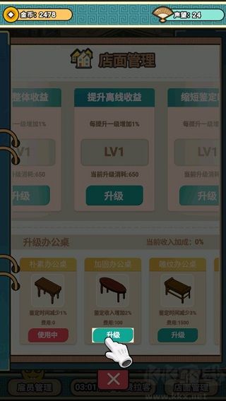 6.最后,我們來了解一下店面管理相關事宜。在店面管理工作中,可對辦公桌進行升級操作,具體方式為點擊 “店面管理”。