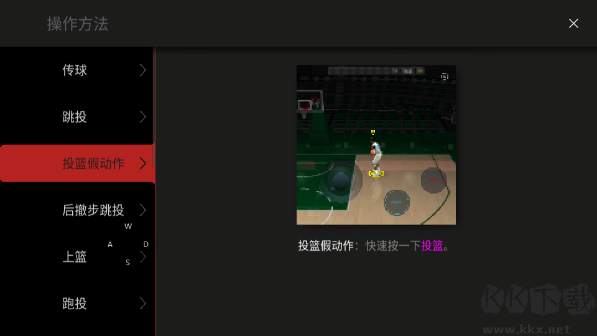 5、其中采用動圖形式,向玩家詳盡展示了傳球、跳投、假動作、后仰步跳投、上籃、跑投等諸多操作 。
