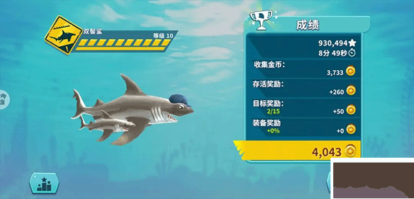 4.這樣我是差不多不到九分鐘的存活時間,我用雙髻鯊就收集了不到4000的金幣,存活獎勵就260了,這可是我玩饑餓鯊的一個新高,也算是很驚喜啦!