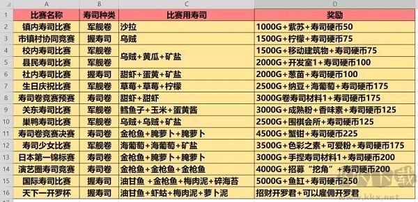 另外,壽司硬幣應(yīng)合理節(jié)約使用。在前期和中期階段,僅對比賽所需的壽司材料展開研究,其余材料可在第十四個比賽結(jié)束后再行研究。