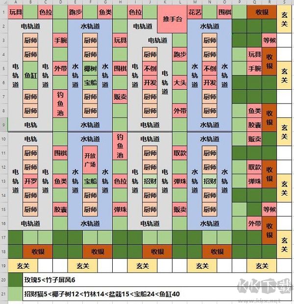 關(guān)于植物布置,在此鄭重推薦:于深綠色區(qū)域放置竹子屏風(fēng),在淺綠色區(qū)域布置竹林。竹子屏風(fēng)適用于前期資金相對較少的階段,而竹林則用于中期提升相關(guān)數(shù)據(jù)之時。