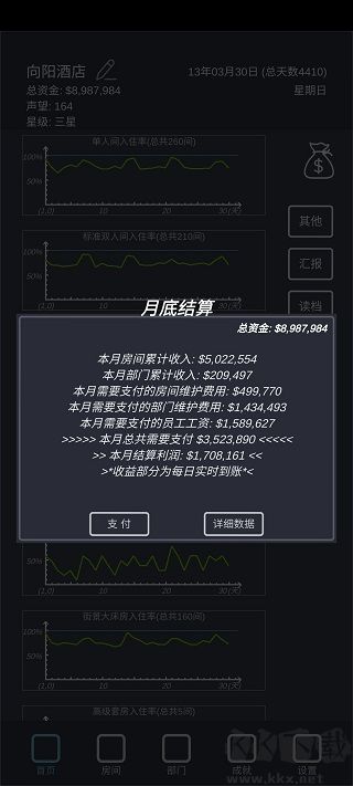 模擬酒店去廣告版是一款文字類的酒店模擬游戲,游戲畫面偏黑色調(diào),參考了真實(shí)酒店布局,玩的時(shí)候,你就是酒店大當(dāng)家,要操心方方面面,得看數(shù)據(jù),安排好單人間、情侶房這些房型,還要管員工,招聘、定工資福利都得你拿主意,游戲里有各種服務(wù)部門,還有成就獎(jiǎng)勵(lì),超逼真,就看你能把酒店經(jīng)營(yíng)成啥樣,感興趣的小伙伴就快來kk網(wǎng)站下載體驗(yàn)一下吧。