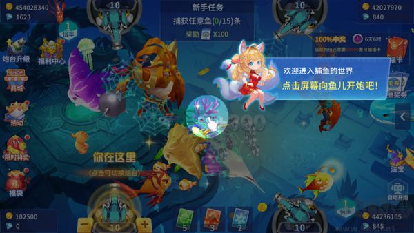 游戲內(nèi)的新手教程由“小狐妖”引導(dǎo),涵蓋基礎(chǔ)操作、炮彈類型、特殊魚種等核心內(nèi)容。