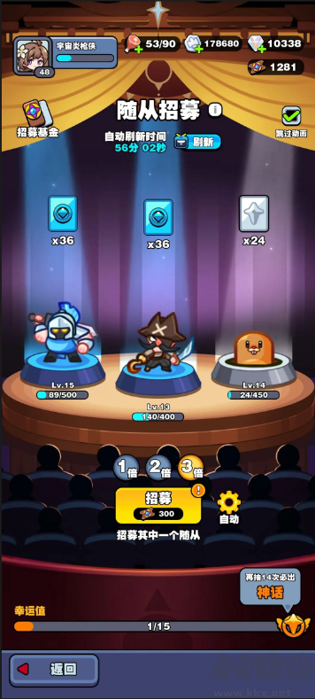 招募里面有10次刷新,建議萌新招募紫色角色的時(shí)候使用3倍召喚,抽中就抽,抽不中也不用磚石去抽獎(jiǎng),抽到神話(huà)再使用磚石抽獎(jiǎng),藍(lán)色角色騎士特別強(qiáng),也可以遇到騎士的時(shí)候3倍抽騎士