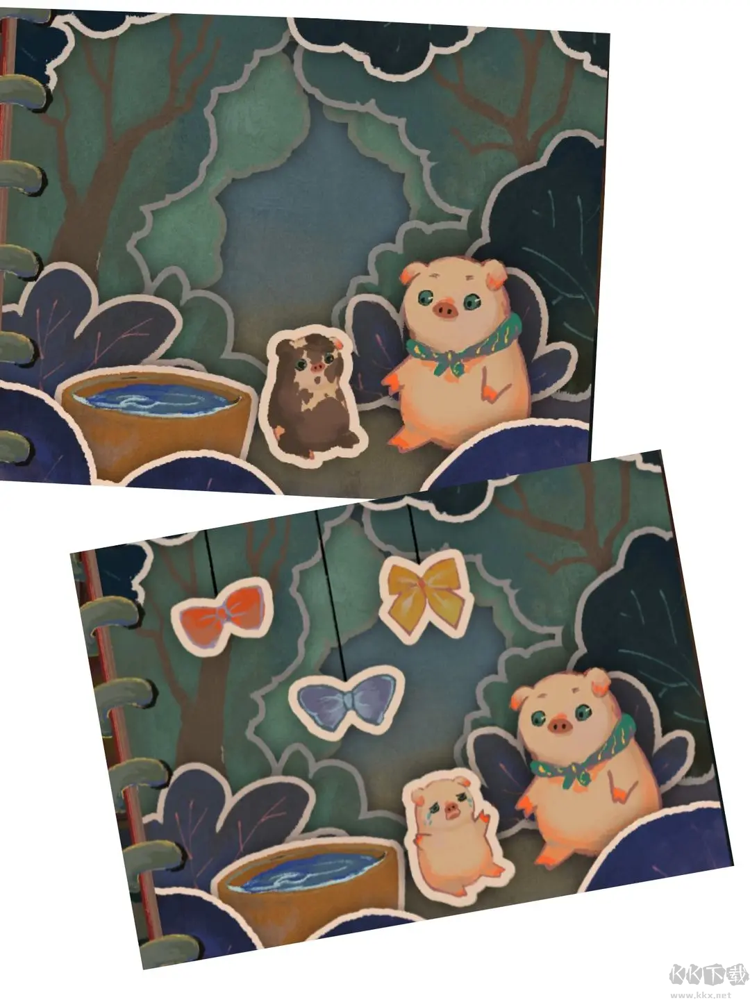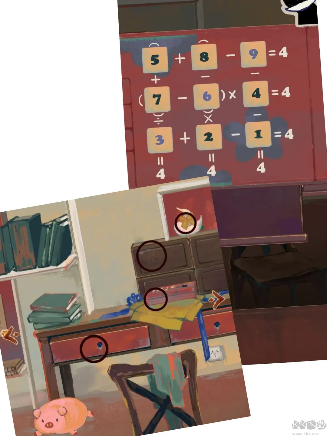 拉開門栓點(diǎn)擊木門,把帽子小豬旁邊的箱子點(diǎn)開,拿到圓盤(不知道叫啥姑且叫它圓盤)拖給相機(jī),拍下合照