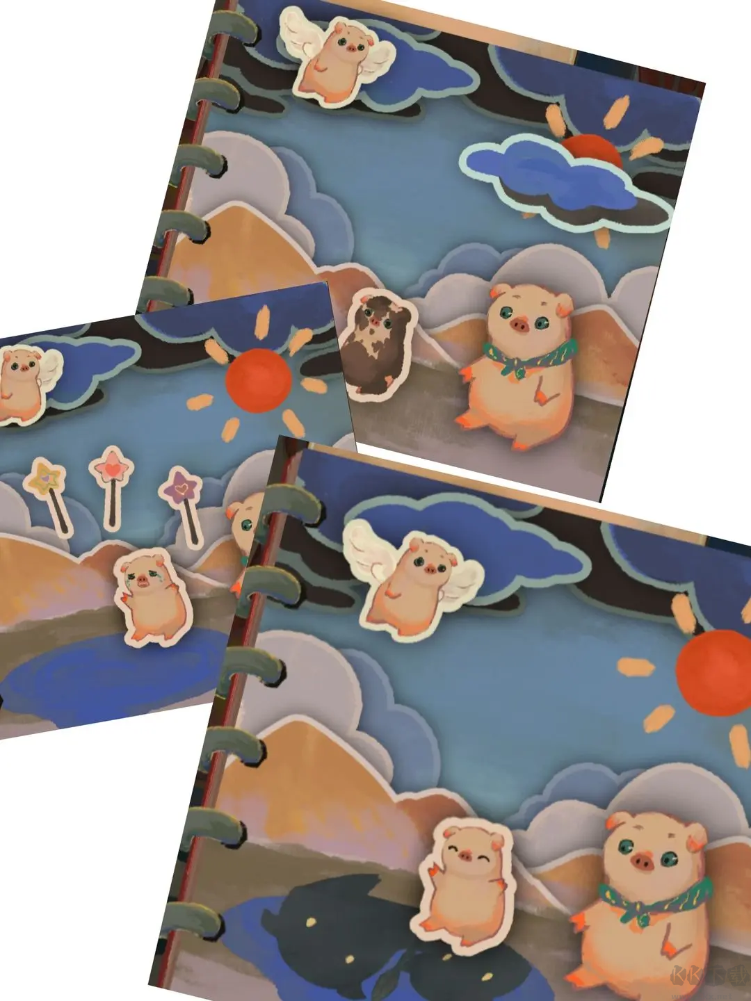 點(diǎn)擊箱子露出小泥豬,拖動(dòng)云朵沖洗干凈,選擇中間的魔法棒給她,把天使小豬拖到水面驅(qū)趕惡魔