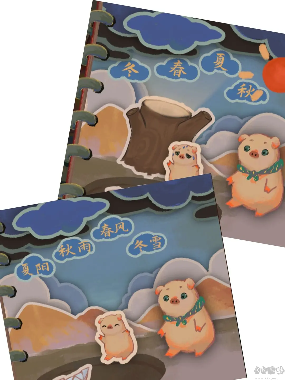 將春拖到木樁上長(zhǎng)出葉子給小豬遮蔭,再拖動(dòng)秋雨積起水洼讓小白船漂浮
