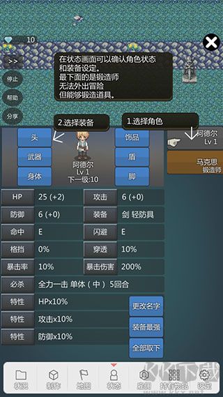 在狀態(tài)界面中,可對角色狀態(tài)及裝備設定予以確認。界面最下方所顯示的是鍛造師,該角色雖無法外出參與冒險活動,但具備鍛造道具的能力。
